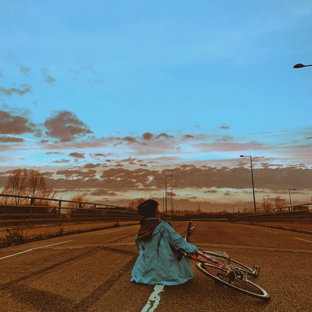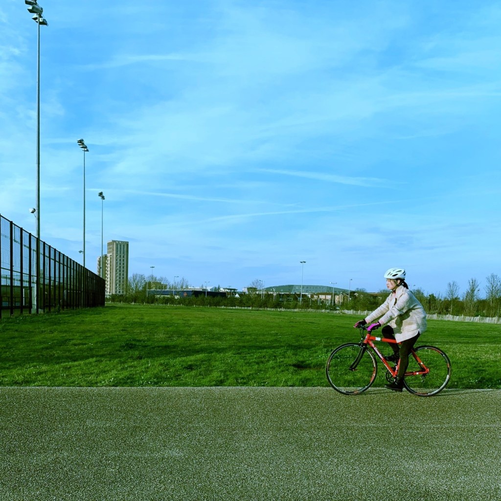 Some of my London memories one month in. London from the viewing platform at Tate Modern. My friend standing beside the river that flows by our campus on a good, rare, sunny day. In front of the Museum of London Docklands – the wind blew hard that day and this big goose was pushed to rush towards us on the water, flapping its wings. Three friends and I went to ride bicycles last Friday at Lee Valley Velopark in Stratford. This was an amazing (free!) opportunity provided by Queen Mary Student Union and advertised to us by the Global Opportunities Office! We got bikes and helmets there for free. Wonderful experience!